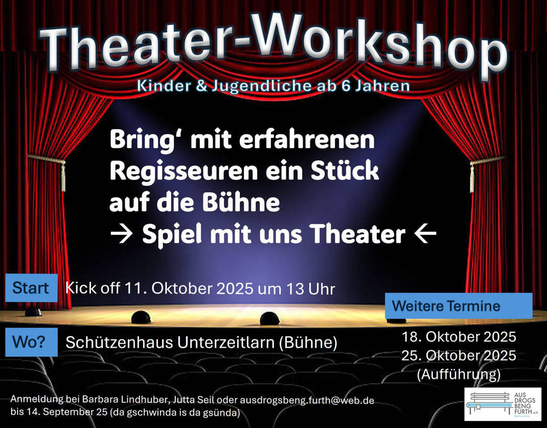 Wir sind immer für was Neues zu haben - deswegen möchten wir in diesem Herbst einen Workshop für Kinder- / Jugendliche anbieten. An drei Samstagen wird ein kleines Theaterstück erarbeitet. Und dann natürlich vor Publikum zum Besten gegeben! Wir freuen uns auf Euch!